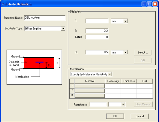 Select Offset Stripline as the Substrate Type. Complete the Dielectric and Metallization filed information. Refer to the Offset Stripline(OSL) Substrate help topic for guidelines on defining offset stripline substrates. When the substrate definition is complete, click OK. If you selected None for the global substrate type in the Choose Layout Technology dialog, the custom offset stripline substrate becomes the global substrate type. When an element is instantiated , it includes a SUBSTRATE=substrate_name entry in its netlist syntax. Designer automatically inserts the global substrate_name into the internal netlist entry for the instantiated element. HFSS视频教程 ADS视频教程 CST视频教程 Ansoft Designer 中文教程 |