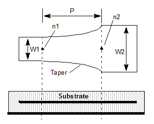 Netlist ExampleA2 Port1 Port2 W1=0.001 W2=0.003 P=0.01 TAPER=ExpWidth where SL1, the selected layout technology or substrate type, has a definition such as: .SUB SL1 SL( B=0.001524 Er=4.40000000000000 Notes1. [All substrates] Node numbers can be reversed, so that n1 and associated width W1 are at the wide end of the taper. 2. [All substrates] The Nexxim exponential width tapered line element has a physical footprint in Designer. 3. [Stripline] The substrate definition should