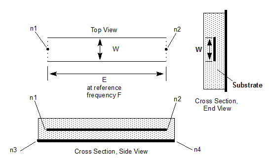 n1, n2, n3, and n4 are the names of the nodes attached to the transmission line. The entry COMPONENT=TRL_E identifies the element as a transmission line with electrical length.
