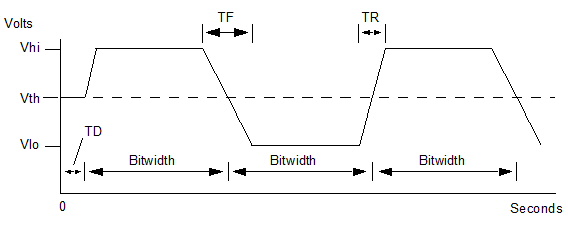 Bit Generator Voltage Source with Jitter Netlist ExamplesV23 23 33 RBG=3 VLO=0 VHI=3 JITTER=1 V43 43 53 RBG=3 VLO=0 VHI=3 JITTER=1 SEED2=1023 In the first example (V23), a random bit sequence is generated with random jitter starting from an internally-generated (pseudorandom) seed. In the second example (V43), the random jitter starts from the given SEED2, and so will be the same each time the simulation is run. Notes1. The RBG source is a time-domain element, suitable primarily for transient analysis simulations. The RBG source can be used in harmonic balance analysis only when a BITLIST is given. See Using the RBG Source with Jitter in Harmonic Balance for details. 2. The BITLIST argument is ignored when a file_reference is supplied via the BITFILE argument. 3. When no BITLIST, BITFILE, or TAPS entry is supplied, the RBG voltage source generates a pseudorandom bit sequence, starting from a random seed value. When no BITLIST or BITFILE is present, the optional SEED can be used to control the bit sequence. The SEED must be an integer value (the maximum absolute value is the maximum size of integers on your system). Using the same SEED guarantees that the same sequence of bits will be generated on each simulation. 4. When a BITLIST, BITFILE, or TAPS is supplied, the RBG source generates the specified sequence of 0 and 1 bits, and repeats the sequence until simulation terminates. When a BITLIST, BITFILE, or TAPS is present, any SEED value will be ignored. 5. In all cases, the sequence of generated bits starts after the time delay given by TD, and continues until the stop time (tstop) of the transient analysis is reached. Each bit changes state with rise and fall times given by TR and TF. and bit duration given by BITWIDTH, measured at the threshold voltage level, VTH. 6. When JITTER_REPEAT is set to 1 and a BITLIST is supplied, Nexxim calculates random jitter data for BITWIDTH, VHI, VLO, TR, and TF on the first iteration of BITLIST, then uses the same sets of jitter data on each subsequent repeat of BITLIST. This results in a periodic signal suitable for harmonic balance analysis. 7. The following diagram illustrates the RBG operation for a source defined as: V23 Port1 0 RBG=3 VLO=1 VHI=3 VTH=2 TD=0.5 TR=0.5