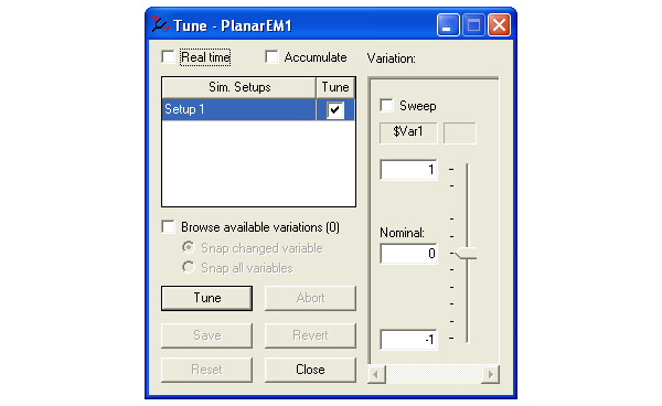 Optimetrics > Tuning a Variable(System, Nexxim, and Planar EM) Tuning a variable allows you to manually modify a variable value and then immediately perform an analysis of the design to test the new value. For example, tuning a variable is very useful after performing an optimization analysis in which Optimetrics has determined an optimal variable value. After the optimal value has been determined, you can then fine tune the value to see exactly how the analysis results are affected. Next, the design can then be updated to reflect a design variation solved during such a tuning analysis. The results of each solved design variation are saved for post processing.