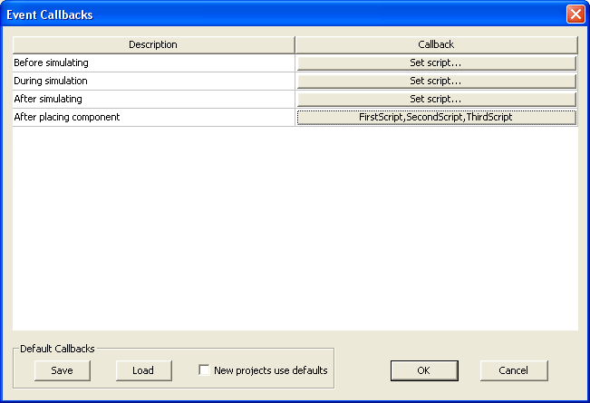 Working with Designer Projects > Event CallbacksOperations you perform in Designer are called “events” — operations such as placing a component or running a simulation. Event Callbacks allow you to define custom JavaScript and VBScript routines that will run automatically after a triggering event in Designer is detected. After configuring callback scripts, you can save the script settings to the registry and then: Load callback script settings into any project Set an option to load settings into all new projects that you create