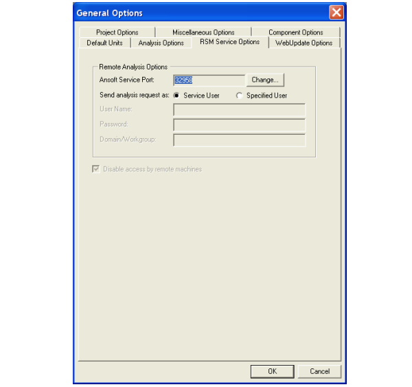 Remote Analysis Options Allows you to specify the user name for a remote simulation: Allows you to change the Ansoft Service Port. Allows you to Send analysis request as either a Service User or Specified User. If you select Specified User, enter the desired User Name, Password, and Domain/Workgroup information.