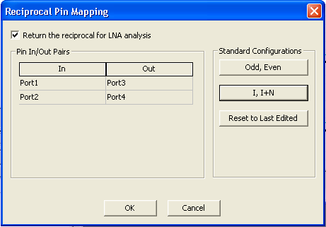 To enable the reciprocal operation, click the box Return the reciprocal for LNA analysis. Use the Standard Configurations buttons to select the pin mapping configuration used by your subcircuit. The illustration above shows the Odd, Even configuration with four ports; the odd-numbered ports 1 and 3 are the inputs and the even-numbered ports 2 and 4 are the corresponding outputs. The figure below shows the I, I+N configuration; now the inputs are ports 1 and 2, while the corresponding outputs are ports 3 and 4.