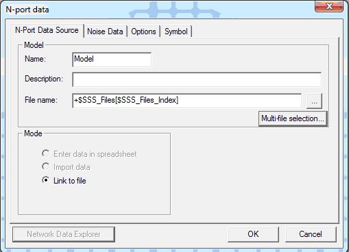 Name — Used to set or change the name of the imported solution as it will appear in the project tree. To change the name, click in the box and then type the name you want. Description — Used to set or change the description of the imported solution. To change the description, click in the box and then type the description you want. File Name — Used to set or change the file name of the imported solution. To set the file name, click in the box and then type the file name you want, or browse (...) for a file. Multi-file selection — Used to create a State-space model. For more information, see Creating a State-Space N-Port Model. Mode — The network solution data can be entered manually, copied into the project from an external file as Import data, or read from an external Link to file at analysis time. To manually enter solution data, click Enter data in spreadsheet, and enter the network data. Network Data Explorer allows you to view solution data by opening the Network Data Explorer. When the N-Port Data Source options have been entered, click OK or select another tab.
