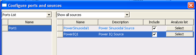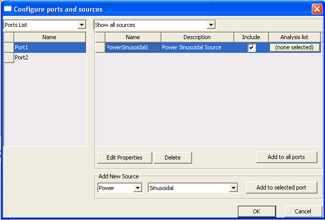 Click in the Name field to assign a name other than the default (“PowerSinusoidaln”). Assign new values or units to the source parameters in the Parameters window by clicking in the Value or Unit field to be changed. Click OK in the Properties dialog. The Select Analysis dialog opens: ![]() Use the checkboxes to associate the source with one or more analyses. Click OK to return to the Configure sources and ports dialog. The Configure ports and sources dialog box now shows the new source.