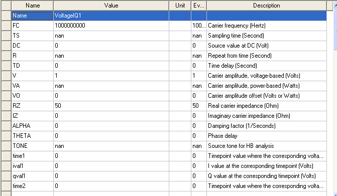 IQ-Modulated Port Voltage Source In the Add New Source panel, select Voltage and IQ. Click Add to selected port. The Properties window lists the IQ source parameters, as in the screen image below.