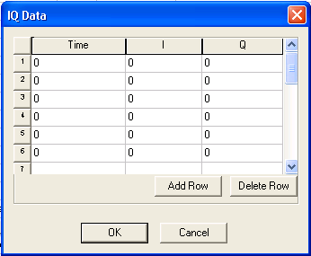 Click in the Name field to assign a name other than the default (“PowerIQn”). Assign new values or units to the source parameters in the Parameters window by clicking in the Value or Unit field to be changed. To assign the IQ time and data point manually, either enter the values in the time, ival, and qval parameter fields, or scroll down to the bottom of the property listing and click theIQ Data button. The IQ Data dialog opens: