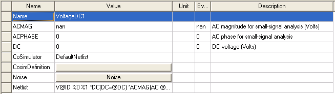 Assign new values or units to the source parameters in the Parameters window by clicking in the field to be changed. For Nexxim port voltage sources, you can specify noise data by clicking on the button in the row for the noise property. See Adding Noise Data to a Nexxim Port Source for details. When all parameters have been entered, click OK. The Select Analysis dialog opens. Use the checkboxes to associate the source with one or more analyses. The Configure ports and sources dialog box now shows the new source.