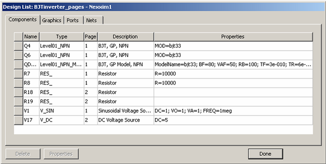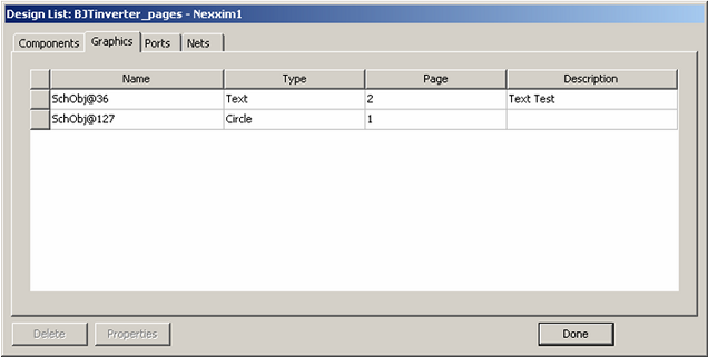 Components Tab ![]() Name: Shows the ID of the schematic component Type: Shows the component name from the library Page: Shows the page number on which that component is located Description: Shows the component description Properties: Shows the overridden properties of that component