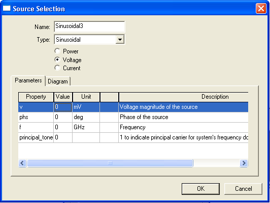 Select Voltage as the Source type. Click in the Name field to assign a name other than the default. In System designs, Port voltage sources can be Sinusoidal or Multitone Sinusoidal. Sinusoidal is the default. The display above shows the Sinusoidal parameters. To see a diagram of the waveform for this source, click the Diagram tab. The diagram is generalized, and does not change when you change parameter values. When all data for the source have been entered, click OK.