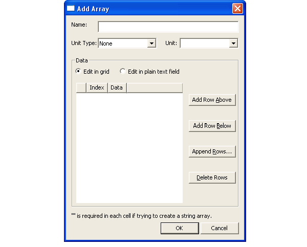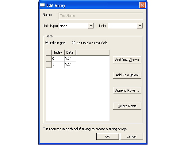 To add an array variable, click Add Array in the Properties dialog and the Add Array dialog opens: ![]() Use the control buttons at right to add, delete, and reposition rows in the value grid at left. The default is Edit in grid, but you may select Edit in plain text field. Note, however, that quotation marks (“ ”) are required as delimeters when array values are entered in either the grid or text field. Click OK when you have finished entering values.