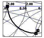 To develop the output matching network:1. Select the Matching tab, and then click New Match. 2. Click Start Point, and then click the marker at 1.26−j2.22. 3. Click the shunt capacitance button. An arc appears on the Smith chart to show the result of the impedance transformation the capacitor performs. 4. Drag the capacitor’s adjustment box to the R=1 grid. The Nominal Value box displays the value of this component as approximately 120 fF. 5. Click the series inductance button. Drag the inductor’s adjustment box to the Smith chart origin. The Nominal Value box displays the value of this component as approximately 10.7 nH. The output matching portion of your chart should look like this: