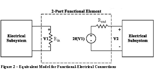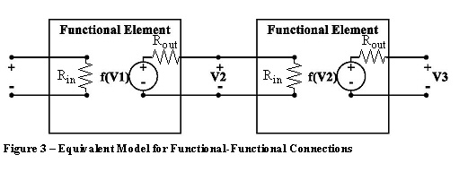 3. The impedance seen by a functional component looking into an input port of another functional component is assumed to be Rin (typically defaulted to infinity) and the impedance seen by a functional component looking into an output port of another functional component is assumed to be Rout (typically defaulted to zero). This is illustrated in Figure 3 below.