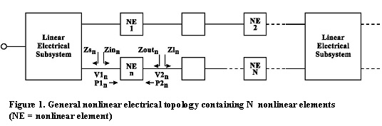 Such a topology is typically comprised of multi-port linear passive elements and two-port linear/nonlinear active elements. In addition, it is assumed that the system has only one input port where a single-tone RF source is applied during analysis, such as those sources with swept parameters. Single-tone frequency domain analysis is primarily based on evaluating the admittance matrix Y and the corresponding noise based correlation matrix J. The admittance matrix may then be used to solve for the system’s internal/external voltages using Kirchoff’s Current Law (KCL) linear formulation. The Y-parameter representation for two-port/multi-port elements may be easily obtained from the S-parameter characterization by means of commonly used transformation formulas [1]. For an RF source with a given input carrier frequency fc and an available input power P1 applied to the input port of the system, the Y-parameters and noise correlation matrices are calculated for each passive and active electrical element within the entire system. These matrix calculations are typically associated with each element’s single-tone input frequency. In general, during single-tone frequency domain analysis, the frequency within the system may be translated due to the presence of mixers. It is assumed that this frequency translation (i.e., mixing) is linear in nature (i.e., does not generate any additional harmonics) to ensure the presence of a single-tone at each node within the system. Analysis of harmonics and intermodulation products generated by mixers and nonlinear amplifiers will be discussed later in the section on Multi-tone Frequency Domain Analysis. For an N-port linear electrical element, the NxN Y-parameters matrix relates the element’s voltages and currents using the following set of linear equations: