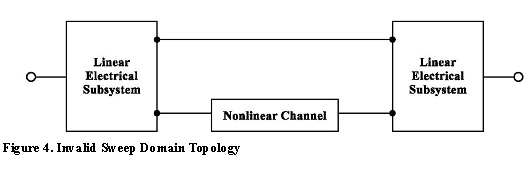 System Simulator > Topology Restrictions for the Sweep Domain1. A valid topology consists of arbitrary linear electrical topologies interconnected by an arbitrary number of cascaded nonlinear electrical channels (containing nonlinear 2-port data, amplifier, mixer and/or frequency multiplier). An example of an invalid topology is shown in Figure 4. This topology would become valid with the added nonlinearity in Figure 5.