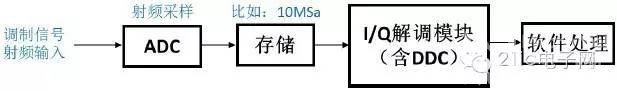图4 传统数字示波器对调制信号处理流程图4显示了传统示波器对于该类调制信号的处理流程。针对上述问题,载波频率为300MHz,调制带宽为2MHz,那么信号的最高频率为301MHz。根据奈奎斯特采样定理,ADC所用的采样率必须为信号最高频率的2倍及以上才能真实的还原波形。我们假设传统示波器ADC使用2倍最高频率即602MSa/s的采样率进行采样(示波器采用刚好2倍关系的采样率一般是不推荐的,一般采用3~5倍的关系才能较为真实的还原波形),假设示波器存储深度为10MSa,那么所能采集信号的最长时间为10MSa / (602MSa/s) ≈ 16.6ms。即使用传统示波器对该类信号进行采集,只能采集10多毫秒时间的信号。如果针对载频更高的信号,如2GHz,采集时间则会更短。对于上述问题,R&S示波器采用了硬件实现的I/Q解调模块,其中最重要的部分就是DDC。通过使用该模块,可以采集尽可能长时间的调制信号。