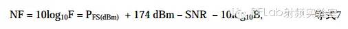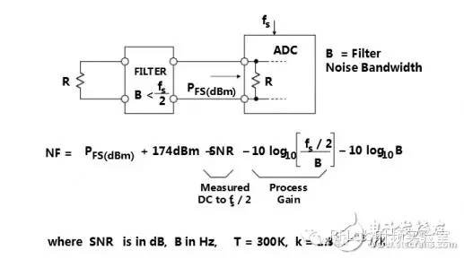 NF计算的第一步是根据ADC的SNR计算其有效输入噪声。ADC数据手册给出了不同输入频率下的SNR,确保使用与目标IF输入频率相对应的值。此外还应确保SNR数值中不包括基波信号的谐波,有些ADC数据手册可能将SINAD与SNR混为一谈。知道SNR后,就可以从下式开始计算等效输入均方根电压噪声: