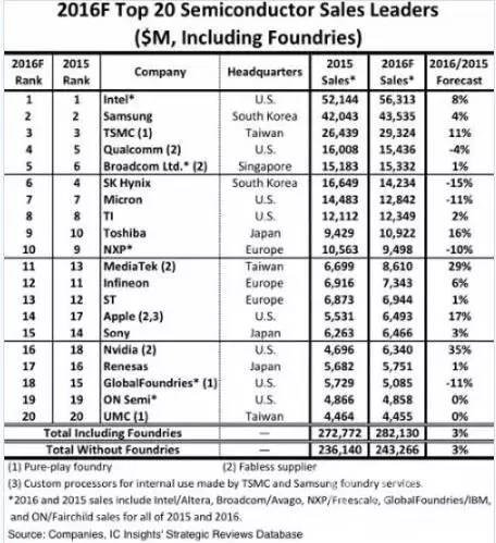 IC Insights发布了2016年全球前20大半导体公司的排名预测。在这份榜单中,有8家总部在美国,3家在日本,3家在中国台湾地区,3家在欧洲,2家在韩国,1家在新加坡。英特尔2016年预估营收563.13亿美元,依旧稳居半导体业龙头。排名第二的三星,营收预估至435.35亿美元。前20大半导体企业中,有3家是纯代工厂(台积电、GlobalFoundries和UMC),5家IC设计公司(高通、博通、联发科、苹果、英伟达Nvidia)。如果不计3家纯代工厂,AMD(42.28亿美元,估测的2016年销售额)、海思(37.62亿美元)和夏普(37.06亿美元)将进入前20。