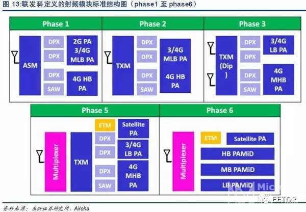 3射频器件国产替代空间广阔 手机等终端的射频器件主要包括PA 芯片、滤波器、射频开关、天线。天线是目前国产化率最高的细分领域,信维通信(300136)、硕贝德(300322)等在终端天线领域已经达到全球领先水平,产品已经进入苹果、微软等国际巨头供应链体系。国产PA 芯片在2G、3G、WiFi、NFC 等通信系统中已经实现了大批量出货销售,而在4G PA 芯片领域,国内厂商还处于客户认证及商业谈判阶段。射频滤波器及射频开关的国产化率相对较低,国内厂商的产品主要集中在军用无线通信系统中,在手机等消费电子产品中的应用较少。 我国是全球最大的手机生产基地,同时华为、vivo、oppo、小米、魅族、联想等国产品牌的手机销售量占全球的30%以上。凭借庞大的终端市场需求,手机供应链向大陆转移是非常确定的产业趋势。事实上,国内不少射频器件厂商已经进入了千元智能机市场,如天珑、西可、海派、TCL 等厂商就已经开始采用中普微的PA 芯片。 3.1砷化镓晶圆代工兴起、接口趋于标准化两大红利助力PA芯片国产化 3.1.1接口趋于标准化 在2014 年之前,射频器件与基带芯片之间的接口各家厂商采用自家的独立接口,各不兼容。市场上一旦某种型号手机销量超出预期,由于没有可被替换的射频器件厂商选,PA、射频开关、射频滤波器等射频器件是手机零部件中缺货最严重的零组件。 2014 年,联发科推出了“Phase 2”整体方案,与Skyworks、RFMD、Murata 等厂商合作推出引脚相互兼容的射频PA 产品。“Phase 2”方案使得终端厂商替换PA 器件的弹性大幅提高,即使出现单一供应商缺货时,其他厂商的产品可以实现快速替补。引脚标准化为国内射频器件企业切入4G 市场提供了机会,国内PA 厂商Vanchip 及Airoha 在2015 年加入了联发科的公板认证,切入了联发科的低阶套片产品。