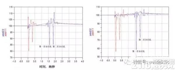 图2中显示的差分过孔设计已构建完毕并经测试。测试样片包括顶层的一对差分线,之后是到内部差分线的差分过孔,然后第二对差分过孔再次连接至顶层的球状引脚栅格阵列封装 (BGA) 接地焊盘。信号路径的总长度大约为1330mil。我用差分时域反射仪 (TDR) 测得其差分阻抗,用网络分析仪测得了带宽,并用高速示波器测量了数据眼图来了解其对信号的影响。图3,4,5分别显示了阻抗、带宽和眼图。左图是使用背面钻孔时的测试结果,而右图是无背面钻孔的测试结果。在图5中的带宽波特图中,我们可以很清楚地看到背面钻孔对于在数据速率大于10Gbps 的情况下实现高性能是必不可少的。
