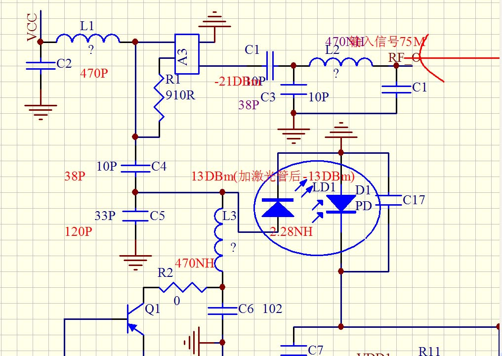 小弟做了个激光发射电路,75M的信号加在激光管上,空载时(不加激光管)信号为强度为13DBm,但加上负载后一下就降到-13dbm了,相关参数我都仿真过了还是不行,现把我现在的电路写在附件里了,还请各高手赐教,如果搞定了可部分现金回报,有意者请直接加我的QQ:313359161