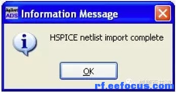 Option 设置完成之后点击OK,回到Import 窗口,通过Browse…选择放在data 文件夹下的Spice 库文件l18u18v.122,点击OK。ADS 开始导入库文件的网表,导入完成后将弹出HSPICE netlist import complete 提醒对话框: