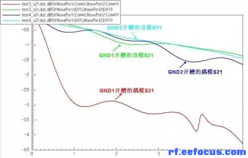 图18开槽平面GND1与开槽平面GND2奇模和耦模的S参数比较图