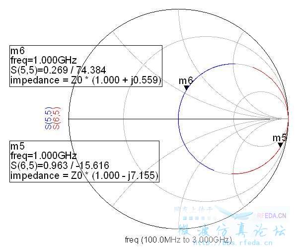 第二幅图是用的史密斯圆图显示的仿真出来的S65参数,我在上面加注了一个点,是在频率为1GHz的时候,显示阻抗为Z0*(1-j7.155)