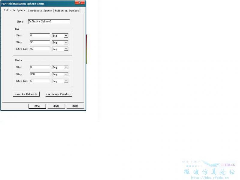 中心频率为:3.33GHz(由于对中心频率没有严格要求,这个也差不多了。)但是方向性好像不太好(我的HFSS的操作步骤是:先创建一个Far Field Radiation Sphere ,phi和theta的设置如下图。