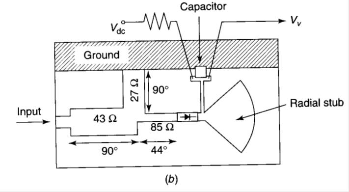 如图所示,是一个二极管检波器,第一个是原理图,第二个是版图,第二个用四分之波长扇形短截线代替了第一个的短截线,我的问题是: