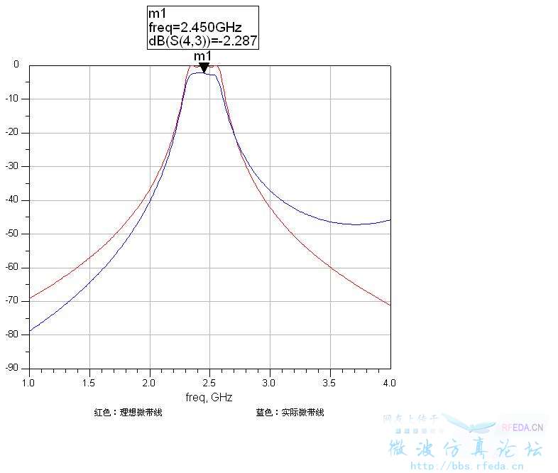 4)仿真结果比较(实际微带有损耗,主要是由于损耗角正切0.01造成的)