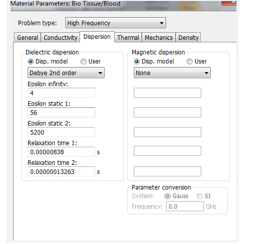 现在的问题是,我如何设定这个血液的材质,主要是电导率和电解色散该怎么设置,特别是的电解色散? 比如图三中我只能设置一组血液的数据,但我想得到像图四类似的图形,eps1从9-90变化,得到不同的介电常数。我该怎么设置?