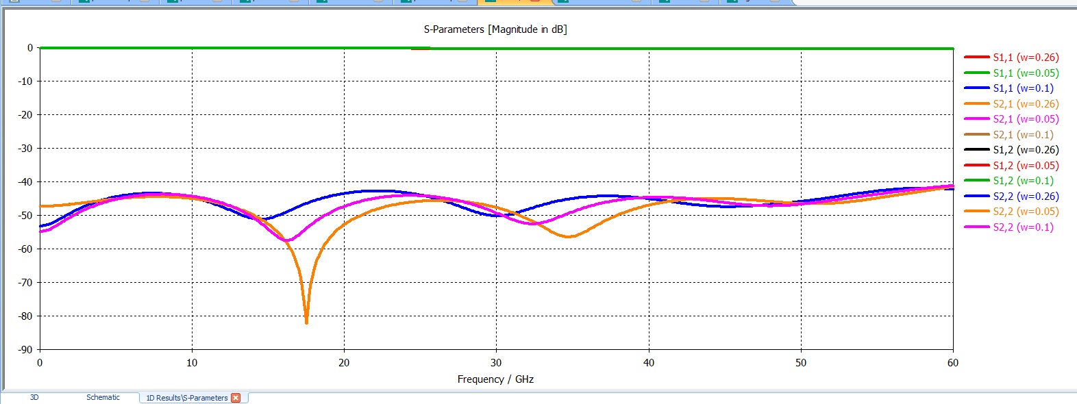 waveguide port的结果和我预想的一致,和HFSS waveport一样,该port在端口处无反射,对于不同阻抗的微带线匹配都很好,损耗很小。