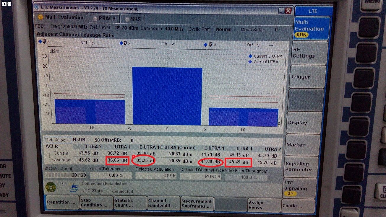 右边的ACLR测试频点,已经出了B7的频率范围了,可能是双工器抑制了一些功率,导致测量结果更好,左边的在B7频带内,不存在这种情况。