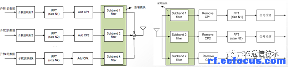 Filtered-OFDM基于子带滤波的正交频分复用,也称可变子载波带宽的自适应空口波形。F-OFDM将整个频带划分为多个子带,在收发两端均增加了子带滤波器。每个子带可根据实际的业务需求来配置不同的波形参数,如子载波间隔、CP长度、FFT点数等。发送端各个子带的数据通过子载波编号后映射到不同的子载波上,并经子带滤波器进行滤波,抑制邻带频谱泄漏带来的干扰。