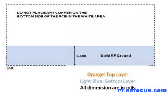 对于为天线馈电更短的PCB走线,这样的宽度要求是比较宽松的。要确保天线走线的宽度和天线馈电接点的宽度相同。在图12展示的情况中,天线馈电的走线宽度不是表2中所规定的宽度。