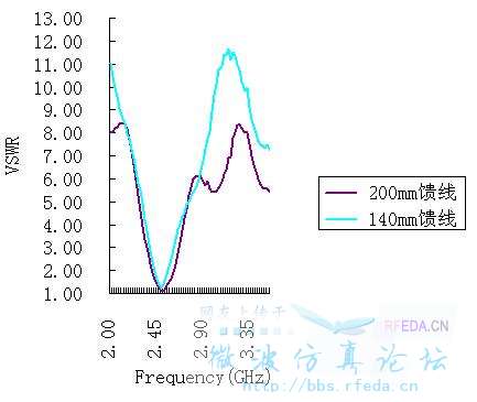 一款2.4G的PIFA天线,馈线分别选择 200mm 和 140mm,发现140mm的带宽明显比200mm要窄。如图示。