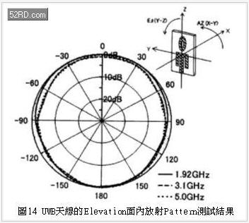 根据图9的Elevation面的放射Pattern显示,本UWB天线可以获得接近8字形的指向性,而且图8与图9测试结果与图6的计算结果非常一致;表1是本UWB天线特性一览。